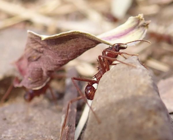 In the Lakeside area, you may see Mexican leafcutter (Atta mexicana) worker ants carrying large leaf clippings or berries atop their oversized heads. Over years of dependency on fungus, the ants have lost the ability to digest leaves directly, so they let the fungus do that for them. The ants carry clippings into their underground fungus gardens and chew the leaves to create compost for growing their fungal crops. Essentially, the fungus farms can be thought of as an enormous external digestive system for the ant colony.