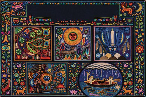 How easy it is to stumble through life, eyes half closed, oblivious to the magic surrounding us, if not as good as dead, perhaps only half alive. We take things we see every day for granted, like the magnificent Indian laurel tree my neighbors cut down last month, or treasures like the three pieces of folk artwork hung in my study. A wake-up call can take many forms, the sounds of chain saws cutting down one’s favorite tree or the discovery of a small book titled Yarn Paintings of the Huichol in a secondhand bookshop.