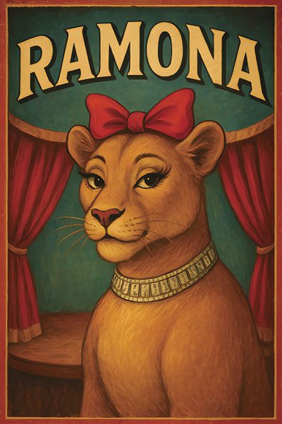 Pepe, a precocious three-year old dressed in a sequined shirt, and purple knickers, led Ramona across the ring, stopping precisely on the center mark. The big lioness sat right down, gazed serenely at the audience, shook her head and joggled her muzzle. Then she opened her mouth and let out a tremendous roar – just like the one we heard in the raspberry patch! Raising one paw in a ‘high five’, she turned around, and took a dramatic and well-deserved bow, clearly enjoying the applause. Pepe led her off, returning in a flash to take his encore. He summersaulted across the ring, snapped off a perfect salute, and bowed like a seasoned trooper.
