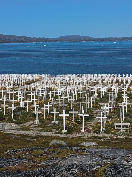 We braved the mosquitoes to visit Nuuk’s cemetery, my favorite stop. A serene expanse of white crosses lines the fjord, as watchful icebergs drift by and the 4000 ft. Sermitsiaq Mountain overlooks the graveyard. Loved ones embrace this view during their eternal rest. On the hill opposite the burial ground, the country’s only maximum-security prison protects the souls.